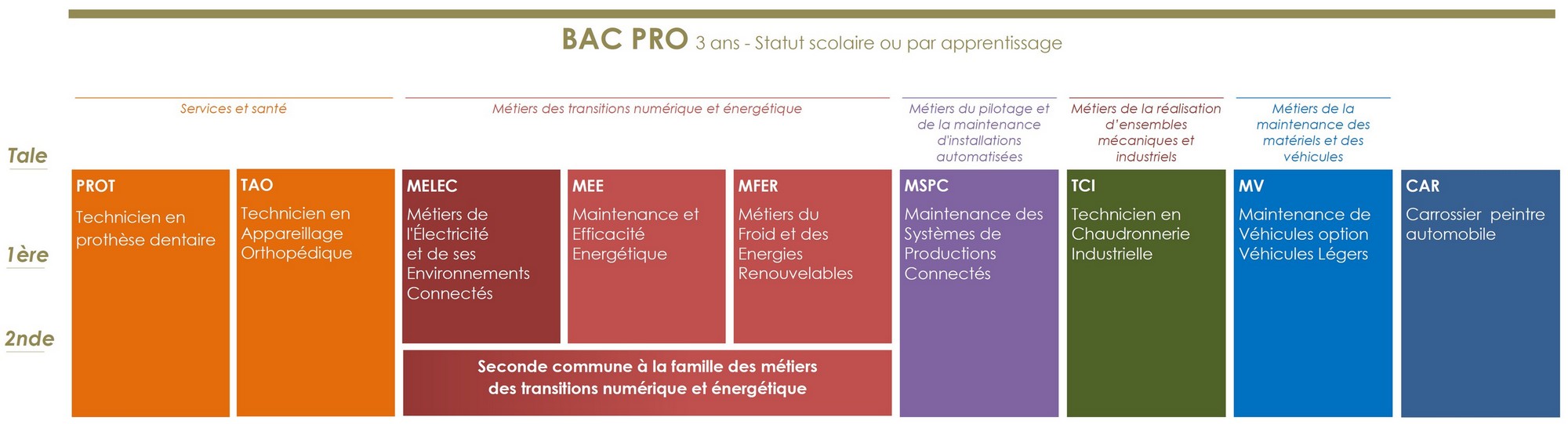Les formations se déroulent par famille de métiers en classe de seconde de baccalauréat professionnel.
